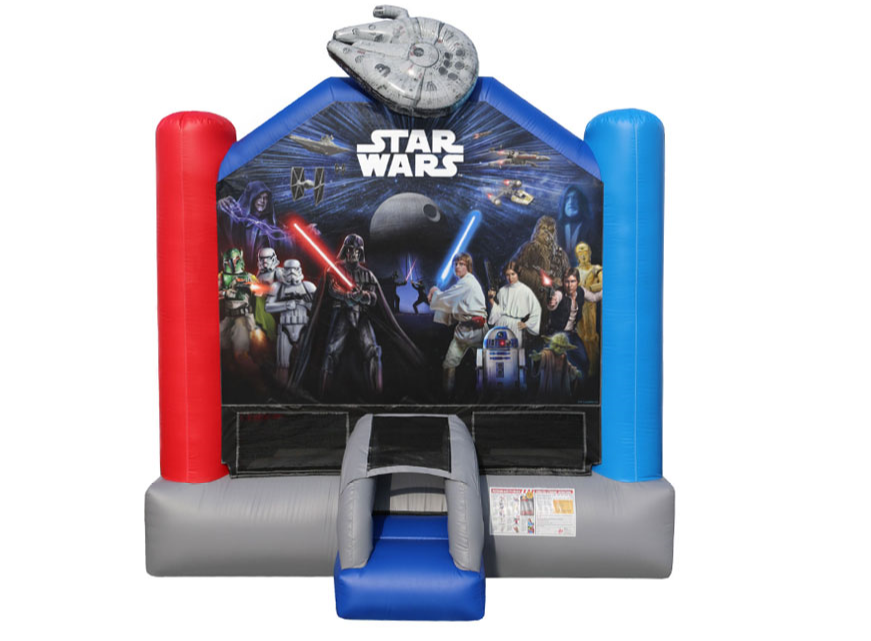 Inspired by a galaxy far, far away is Magic Jump's Official STAR WARS 15' x 15' bounce house. It has plenty of space for up to 6 young Padawan at a time to bounce, hop, skip, and jump to their heart's content. Made with premium materials by master craftsman, the STAR WARS bounce house is designed with fully licensed digital artwork and a unique Millennium Falcon embellishment up top. It is an epic ride that is suitable for all occasions.